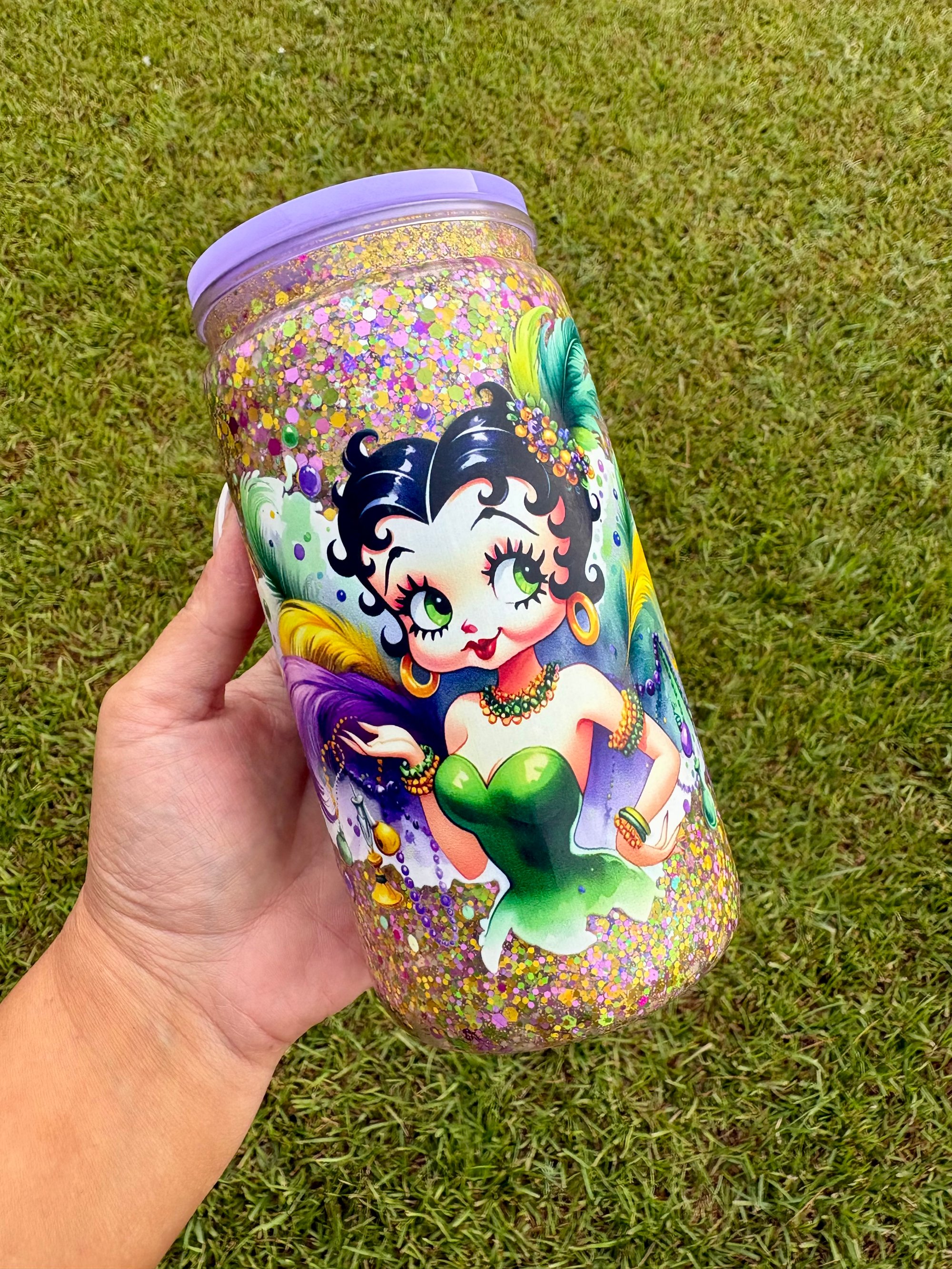 16oz Acrylic Mardi Gras Glitter Snow Globe Cup Coquette Betty Green Purple Gold