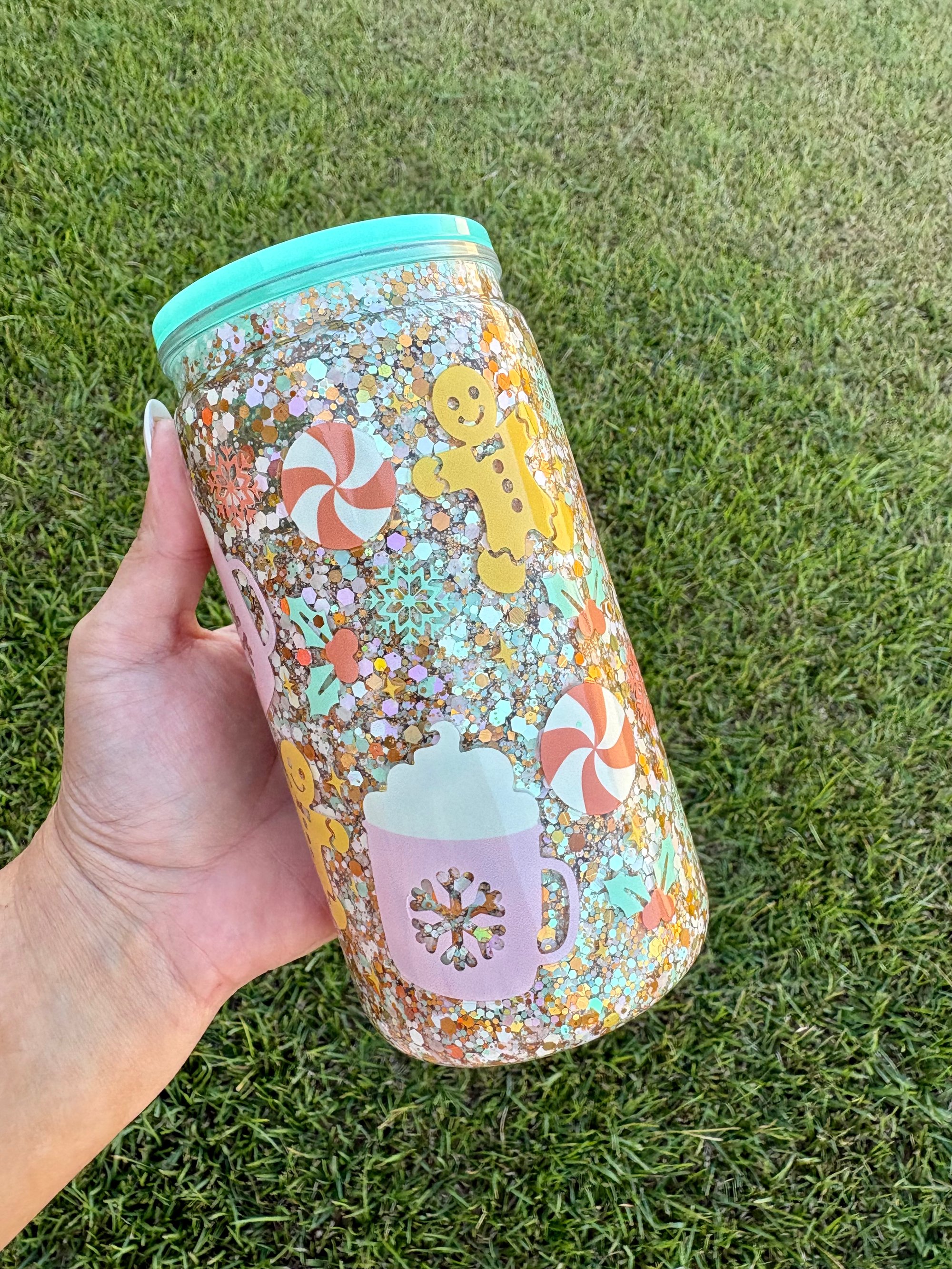 16oz Christmas Snow Globe Cup Gingerbread Peppermint Gold Silver Champagne Pink Mint Green Teal Glitter Holiday Gift