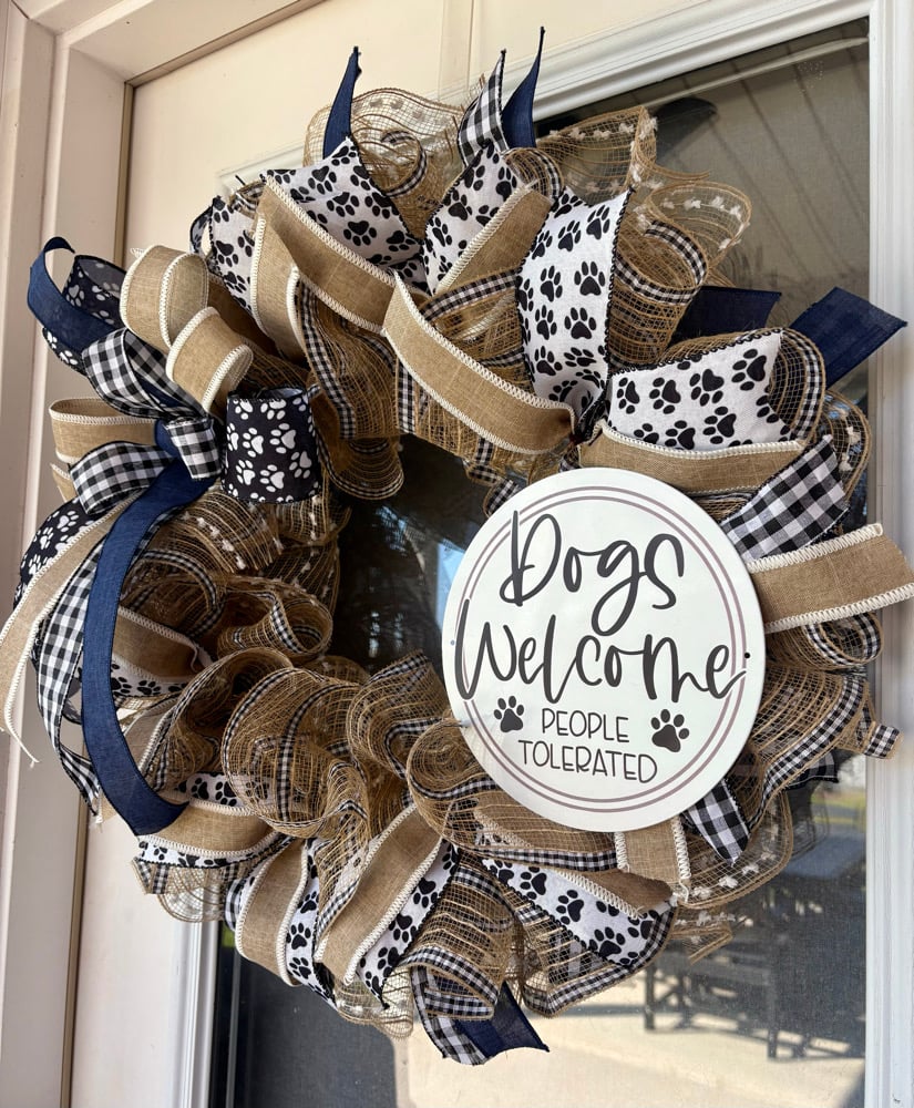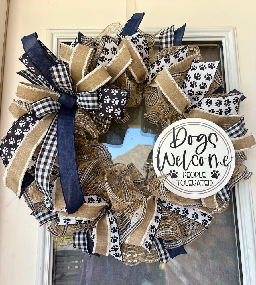 Welcome guests with this charming navy and tan dog-themed wreath. Perfect for pet lovers, it adds a playful touch to your home decor.