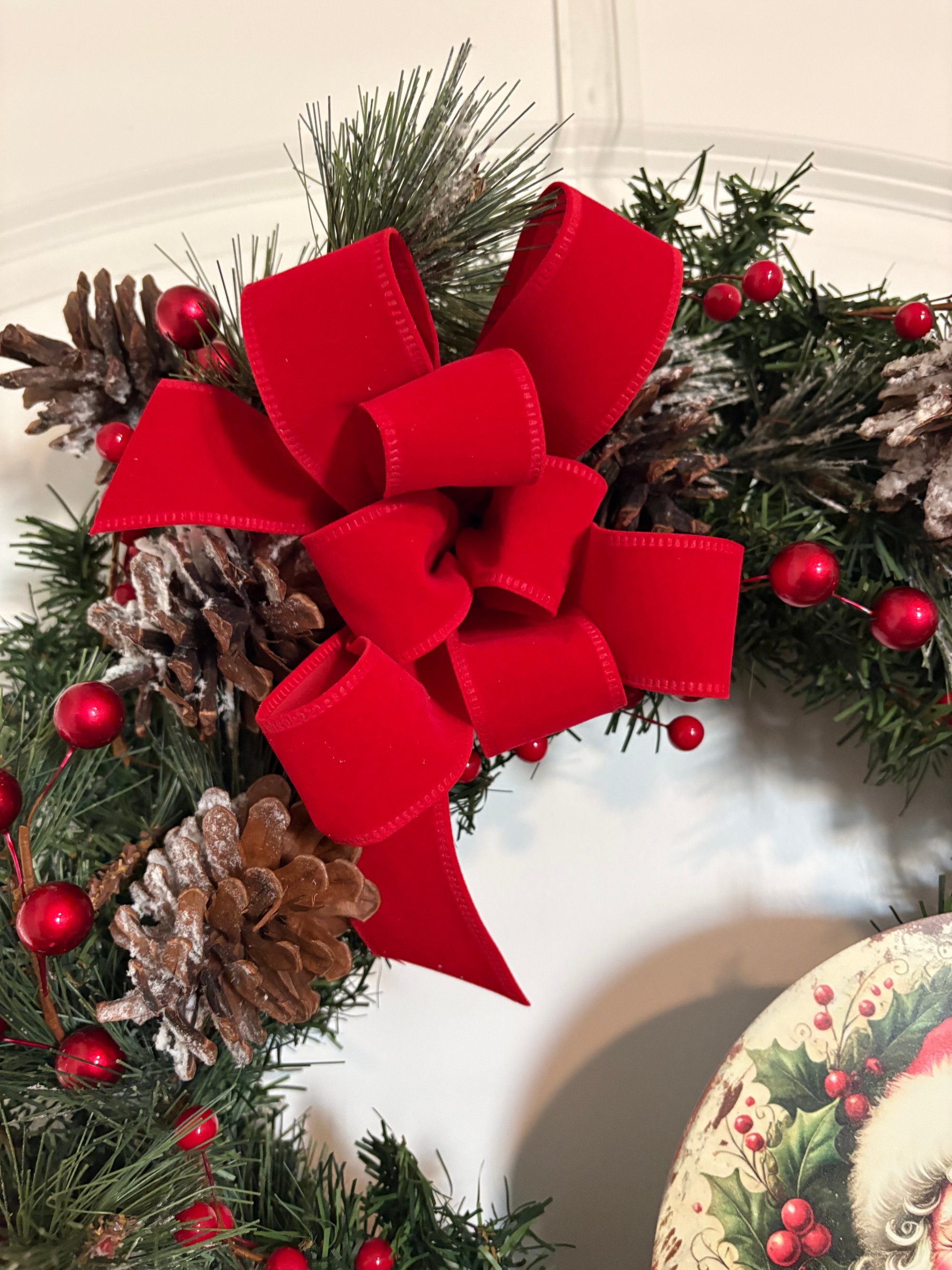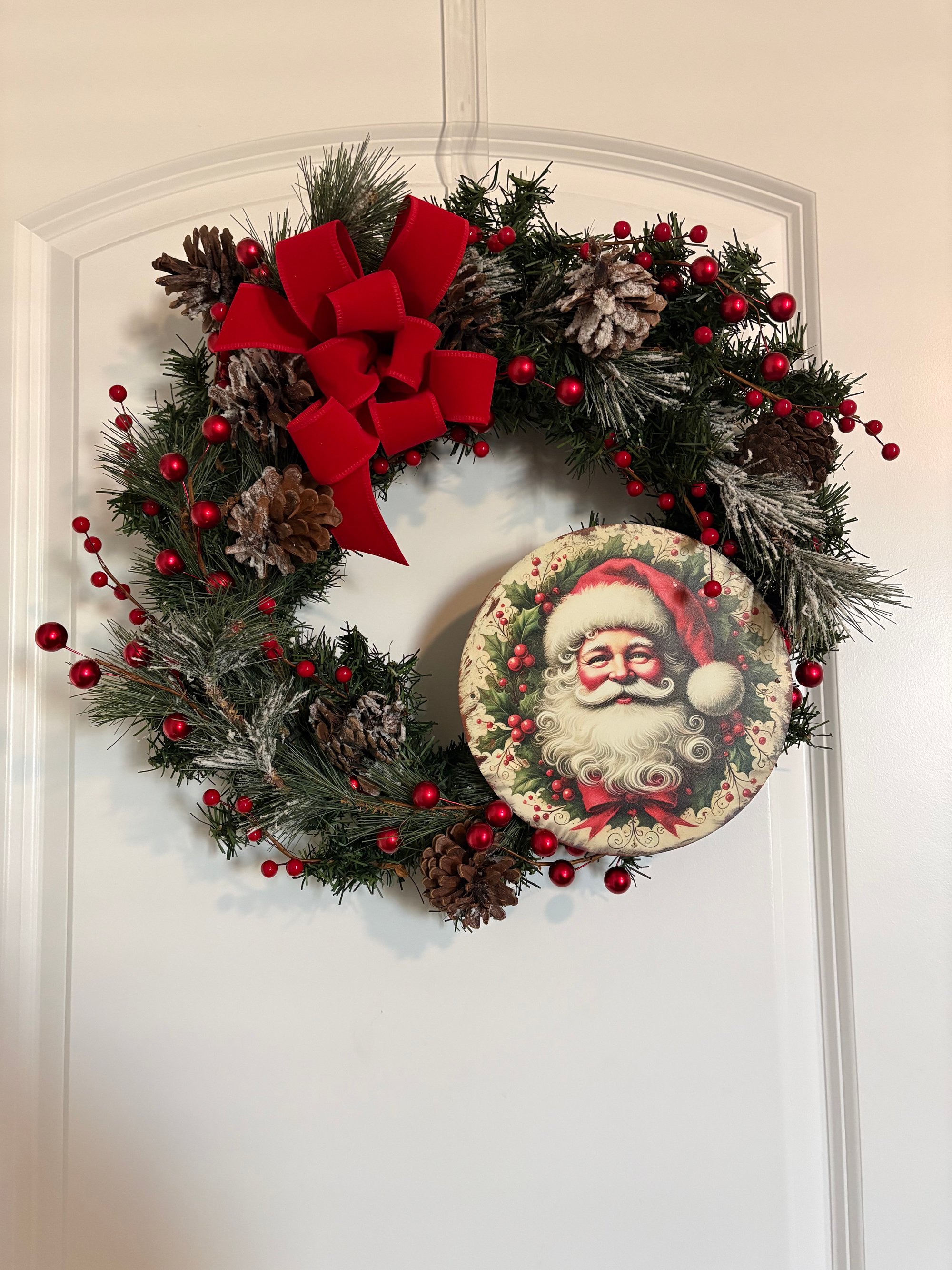 Jolly Santa Red Bow Wreath Merry Christmas Grapevine Winter Happy Holiday Green Velvet Ribbon Holly Flocked Pine Hanger Rustic Farmhouse