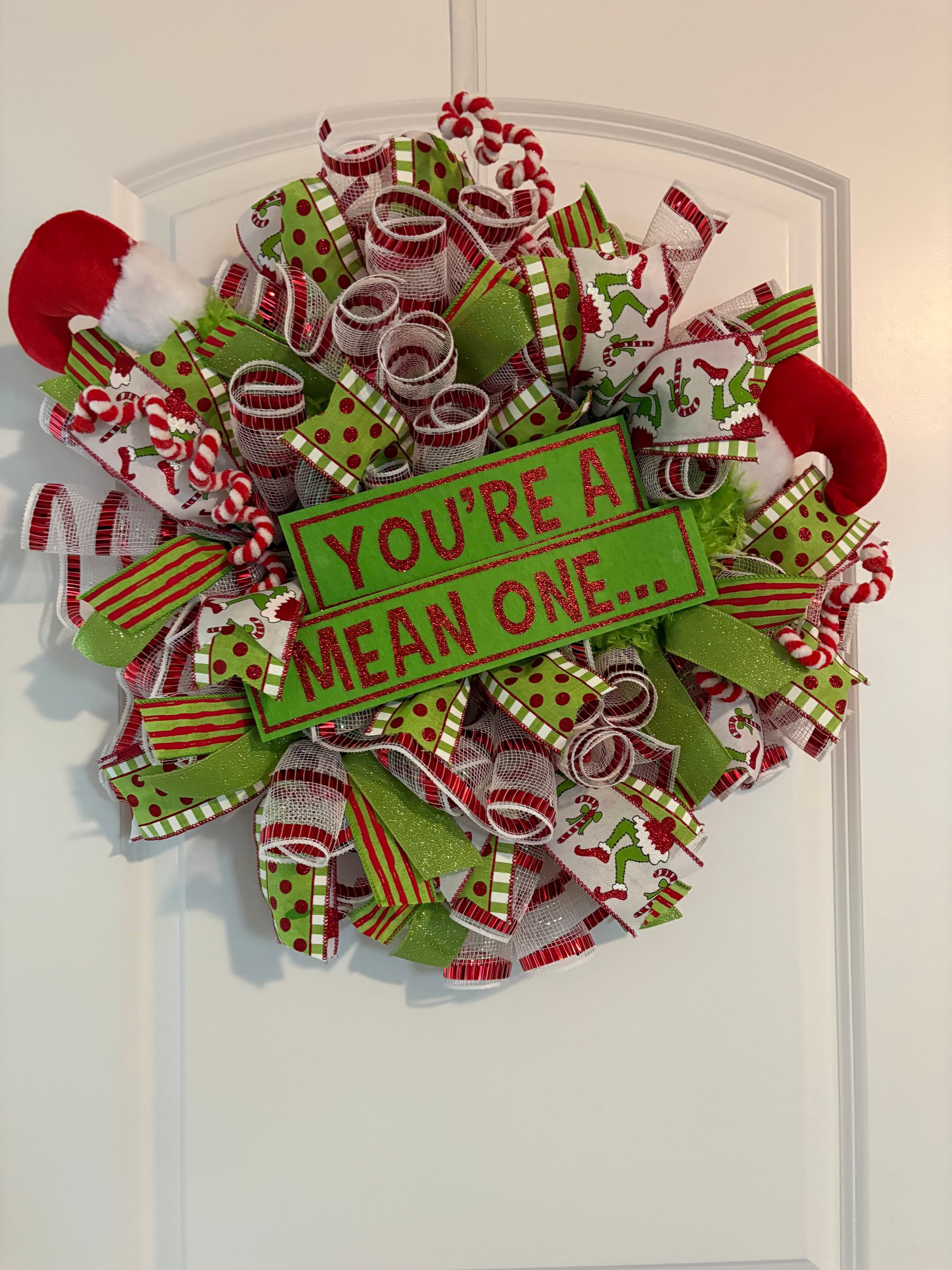 You're a Mean One Elf Red Lime Green Merry Christmas Green Monster Wreath Deco Mesh Glitter Ribbon Polka Dots Holiday Door Decor Bow Plaid